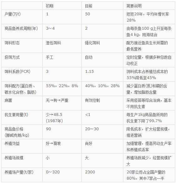 La Norvège a été reconnue comme le modèle mondial le plus réussi de l'aquaculture aquatique de Shanghai, d'abord essayer d'élever le saumon de l'Atlantique à la fin des années 1960 à 70 s succès, en seulement 30 ans, l'eau de la zone de la mer à partir de zéro, et pour le développement de la technologie de l'aquaculture dans le monde le plus mature, le développement le plus rapide, le bénéfice est le meilleur pays. Il UTILISE la technologie de construction de culture anti-ondes à grande échelle, la technologie d'alimentation et d'alimentation composée parfaite, la recherche sur les vaccins, l'élimination automatique des poissons morts, le comptage automatique des poissons et la gestion de l'environnement, etc., marchent dans le monde. Production aquacole de 7500 t, 1980, 1990 1990 t, 460000 t, 1999, 2000 2000 t, 500000 t, 2004, le taux de croissance annuel moyen de 28%. Poissons d'élevage, 95% est le saumon atlantique, la truite, une petite quantité à 95% de la production destinée à l'exportation. À l'heure actuelle, la licence d'aquaculture norvégienne délivre plus de 800, environ 30 écloseries, créant plus de 300. Périmètre 60 ~ 120 m de la zone du cercle PE du pays plus de 5300, plus de 200 élevages, employés directs environ 27400 personnes, une production annuelle valeur de plus de 3 milliards de dollars, l'aquaculture en eau de mer comme le deuxième plus grand pilier de l'économie nationale de la Norvège. Des installations avancées, un bon environnement, d'excellents appâts, une reproduction saine, le génie génétique, le contrôle des maladies, l'enseignement professionnel, l'échelle, etc., déterminent les avantages de la Norvège en matière de reproduction. Norvège au cours des 10 dernières années, selon les matériaux pertinents, le coût de production a été réduit à 16 de 53 couronnes norvégiennes/kg couronnes norvégiennes/kg, l'expérience et la technologie principales sont les suivantes :